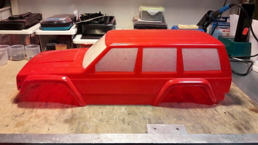 c) Wat afgeplakt wordt is kleiner dan het raam. Met fijn afplaktape de naden opvullen heeft geen meerwaarde omdat na het verwijderen van de fijn afplaktape en de maskers er doorzichtige naden ontstaan die met de hand afgewerkt moeten worden. De kleurkeuze was Apple Candy Red. Lekker opvallend. je moet de kleur laagje voor laagje aanbrengen met tussendoor een minuut of vijf droogtijd. Nu werd het tijd om alle benodigde gaten te gaan boren. Geen lekker idee in een gespoten Body maar - en Patrick had mij dit al uitgelegd - het is niet anders. De eerste gaten waren de gaten voor de bevestigingssteunen. na deze gaten volgden al gauw de gaten voor de Grill, de spiegels, de deurhendels, de kentekenplaatverlichtinghouder en tot slot het Roof Rack. Ook de stickers mochten natuurlijk niet ontbreken. oh ja, wat betreft de Grill : hiervoor moest nog een behoorlijk stuk uit de reeds gelakte Body geknipt worden. Werd ik niet echt vrolijk van