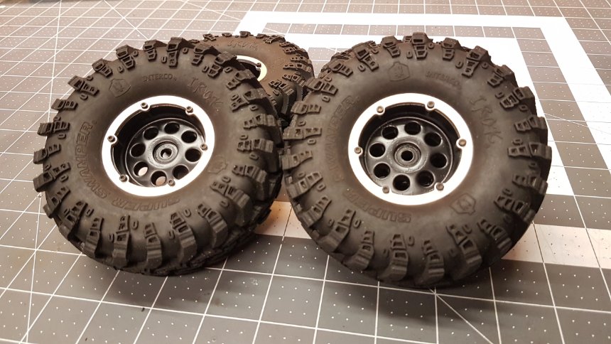 Dus na een schrob beurt met een sopje en een borstel zijn de banden weer moddervrij. Hierna met wat WD40 behandeld om ze weer wat zachter te maken. De WD40 haalt ook het dieper in het rubber zittende vuil los. De foams uitgewassen en ook moddervrij gemaakt. En de beadlock velgen ook schoongemaakt en na drogen opnieuw zwart gespoten.