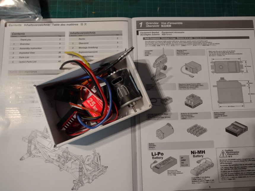 Klein doosje. Veel zakjes. Elektronica, standaard WP1080, 5 pole motor, cheapo servo en namaak Spektrum ontvanger.