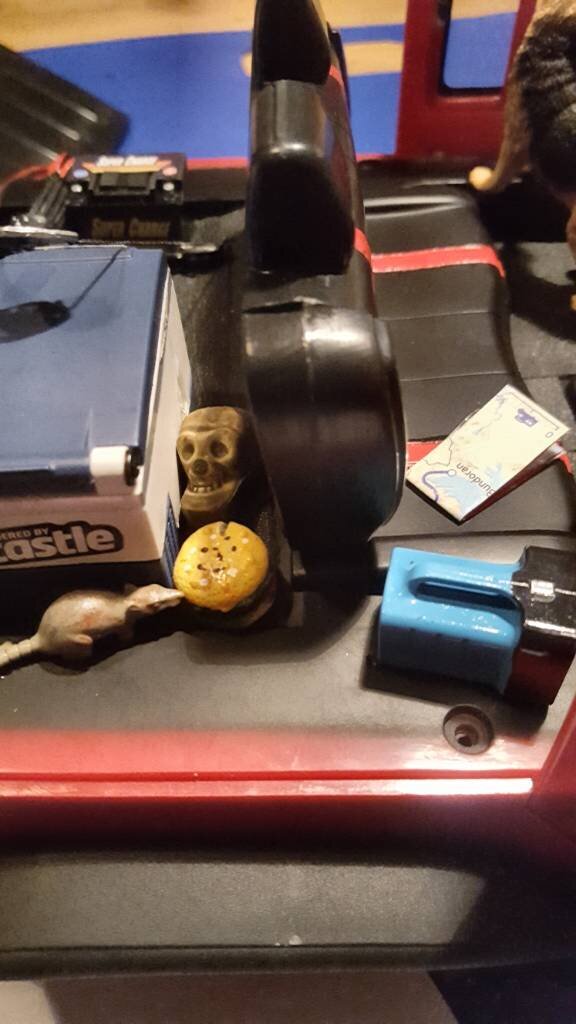 Cola blikje en ook wat achter in gezet. Zaklamp, hamburger, doodshoofd, kaart, en een muis.