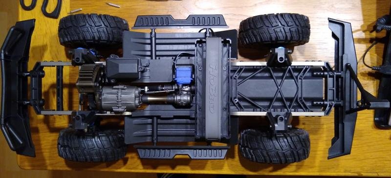 Shock towers... Assen aan de links geknoopt... Veerpootjes er op en de originele wielen er even onder... Wat worden ze toch snel groot, ineens stond ie! Een paar dingen heb ik er voor de foto even aan gehangen, geeft een beter beeld van het eindresultaat. De accubak is op twee manieren te plaatsen: zoals het nu zit, of in de lengte tussen de achterwielen. De bodemplaat met ontvangerbak en schakelservo kan pas gemonteerd worden als de motor (backorder...) er in zit. Nou zal waarschijnlijk niemand dagelijks een motor wisselen, toch zou ik dat anders hebben bedacht.