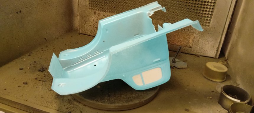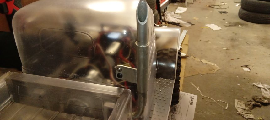 Uitlaatje gesoldeerd van aluminium slang eraan en dan de rook generator eraan. En de koplampen gemonteerd. En ik wilde het 2e poppetje van mezelf gebruiken als bestuurder, maar helaas is die te groot voor deze body.