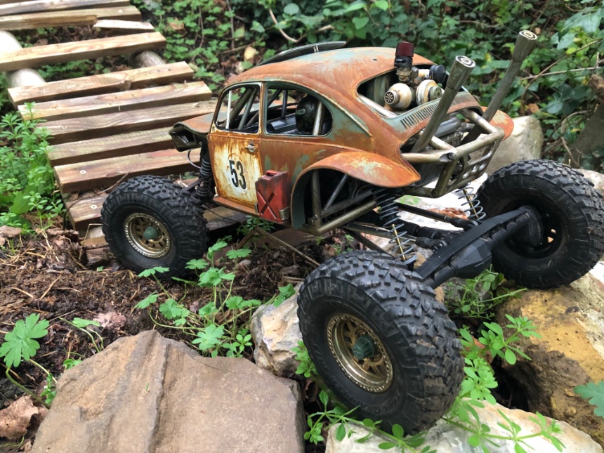 Begonnen met een standaard Axial Capra. Nu wat geupgrade met een custom bug body (combinatie Tamiya en Proline), zelf ineen geknutselde motor en uitlaten van plastiek wegwerpspulletjes. Doel was een beetje MadMax stijl benaderen.