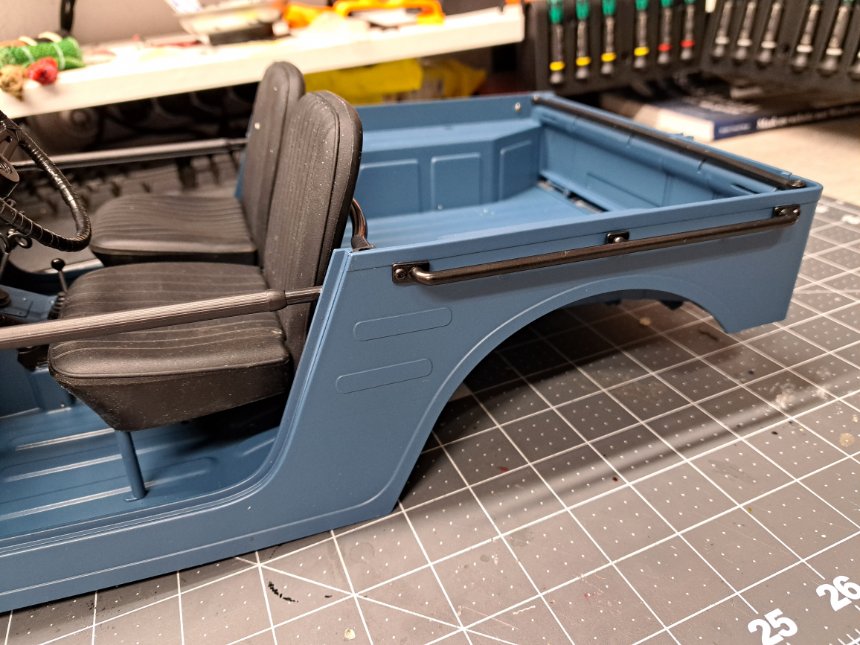 Alles in kleur kunnen spuiten. 3D printer aan het werk gezet voor een autoradio, CB oftewel 27MC radio, een jerrycan en een jerrycan houder. Wat verf doet de rest. Nog wat meer detailwerk gedaan zoals de radiator.