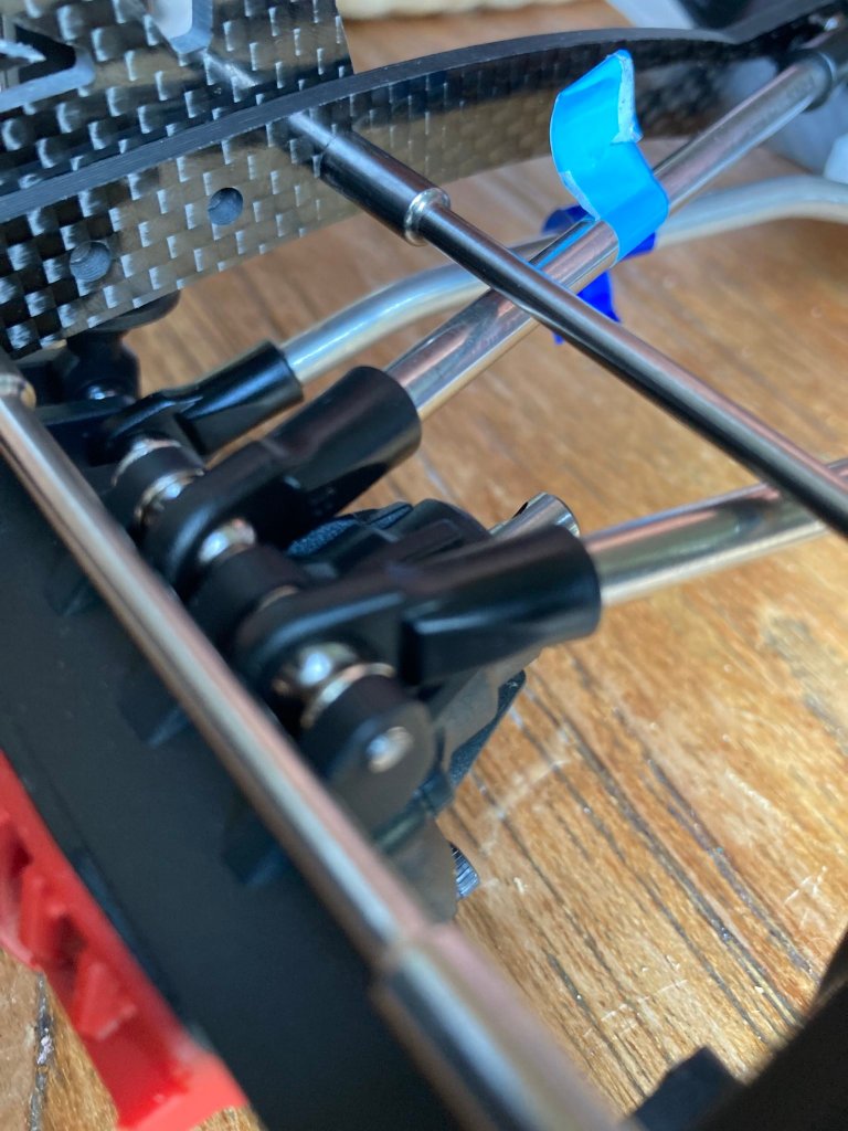 Daardoor past daar ook weer een titanium spacer tussen de shock towers. Eerst ging dat niet ivm de spur.