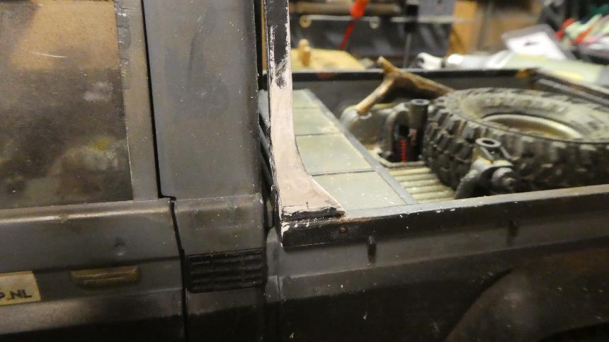 Het hele rek heb ik ca 3 mm naar de achterruit geschoven, en daar over de hele lengte onder de ruit vast gelijmd. Bovenaan wordt het op de spijlen ook nog met 3 subtiele schroefjes en lijm vast gezet.