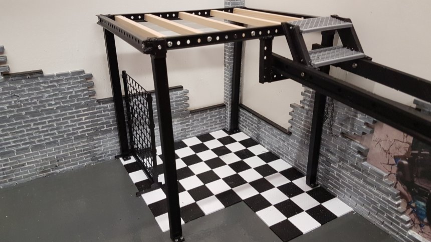 Links en rechts achter in de hoeken wil ik een verdieping maken. Nou kan dat simpel met wat latjes en plankjes. Maar ik wilde een wat meer scale look. Met I-beams en bijbehorende staanders en een industriële look voor de trappen.