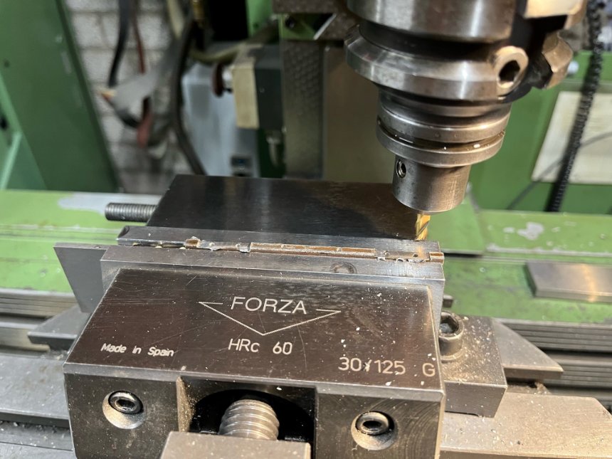 Gaten voor de onderste arm afgetekend op een stukje tape en geboord