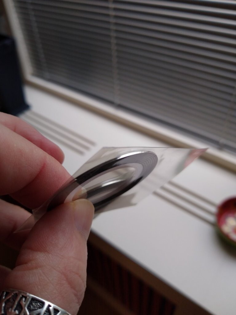 Dan nog iets heel anders... Chroom-tape, 1mm. breed, nail-art-benodigdheden. Tip kwam ik tegen op het Duitse forum, kan ik vast nog wel eens ergens voor gebruiken...