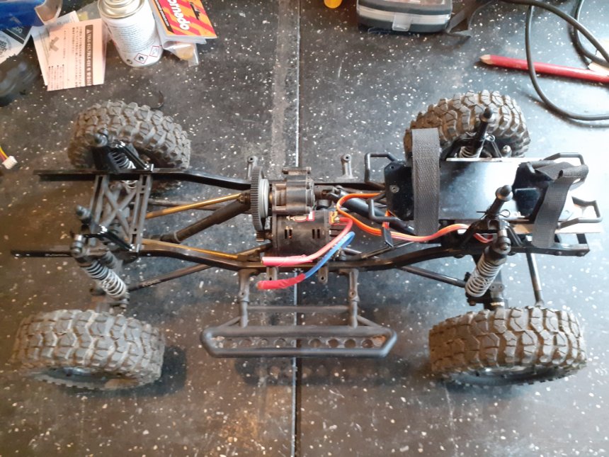 Hey, post uit Tsjechië! Aan de slag, eerst alle electronica strippen: In de doos van RCModelex zat o.a. een RC4WD Mojave body, die even snel in elkaar geflanst om te passen. Dat de wielbasis te groot was wist ik. Dit schijnt op te lossen te zijn door kortere links van Axial te monteren We moeten van 313mm naar een 287 wielbasis. das dus 26mm korter. Echter door voor en achter 91mm Axial links te gebruiken kom ik uit op 22mm korter. Dus we gaan zelf links maken. Hey, post uit Duitsland! Toch 1 setje Axial links bestelt (de laatste die ze hadden) en die op de vooras gemonteerd, das al 7 mm korter. Achter komen dus zelfbouw links, de materialen komen morgen binnen.