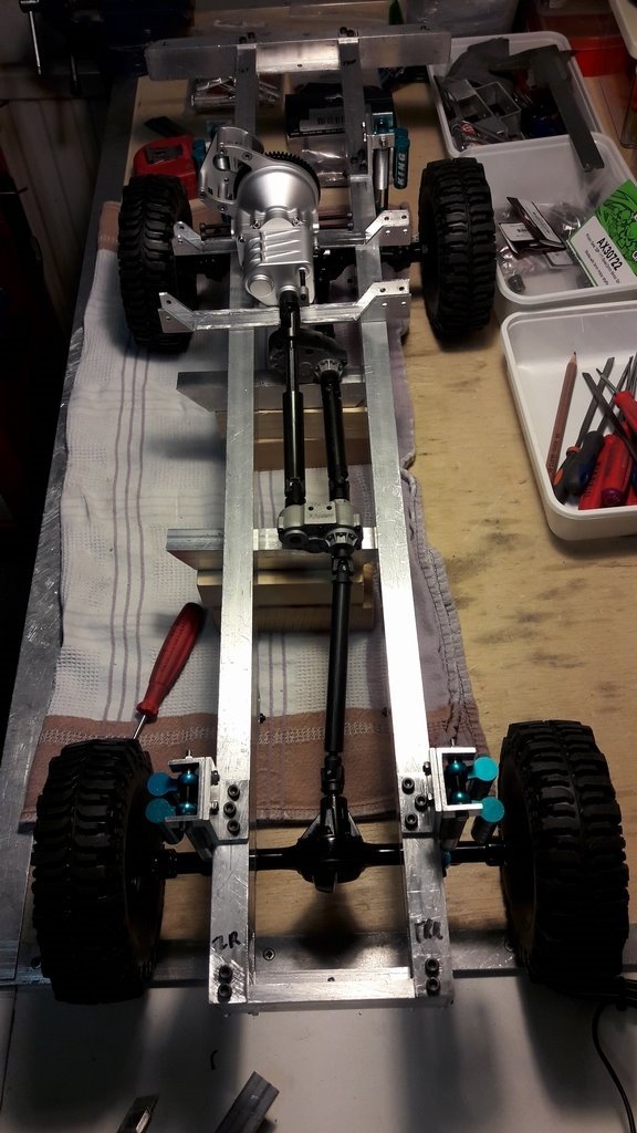 Het basis chassismateriaal is dus aluminium koker-profiel (25x15mm). Deze heb ik op lengte (67cm) gezaagd en verder tot een chassis verwerkt. Hierbij wat foto's m.b.t. de bouw van het chassis :
