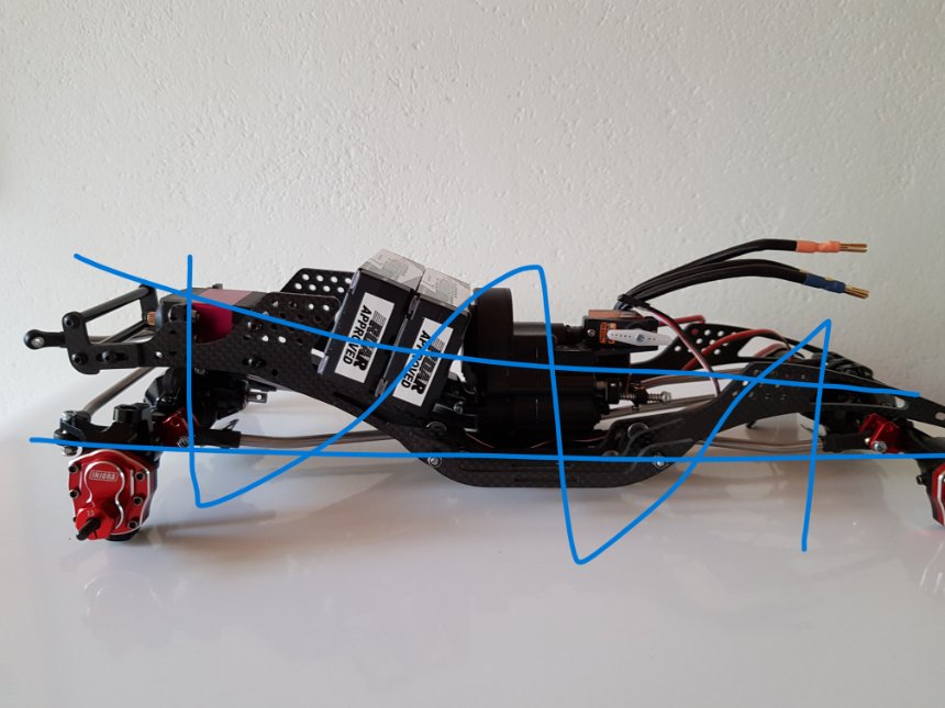 dus veren kunnen nog gewijzigd worden. Veerwegen zijn best lang, zolang dat bij volledig inveren van de assen deze door het chassis steken. Aan de achterzijde is dit geen probleem, maar wanneer de vooras onder een hoek komt te staan loopt de servo tegen binnenzijde aan. Ook de stuurkabel blijft hangen en beschadigd, chassis deels uit elkaar gehaald om ruimte te maken.