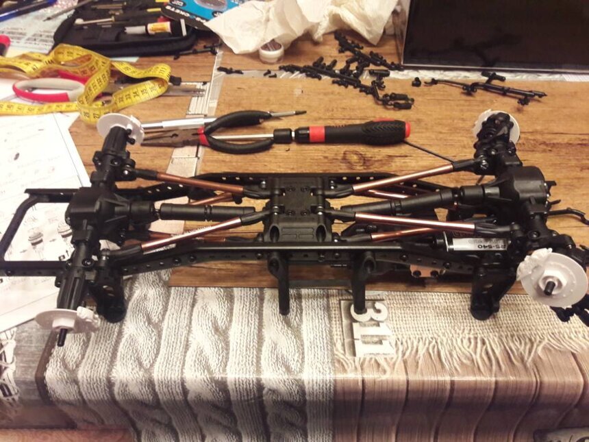 Het chassis is gebouwd. Goed te doen, degelijke kwaliteit en alles zag er gewoon mooi uit. Enige wat me tegengevallen is , de kwaliteit van de schroefjes. Er waren er al een paar krom voordat ze gebruikt zijn. Gaten zijn wel voorgeboord maar niet voorgetapt. Gevolg hiervan is dat er nu ook een aantal schroefjes dol zijn en er dus niet verder in willen maar er ook nog niet uit willen. Hier moet ik dus nog even mee bezig.